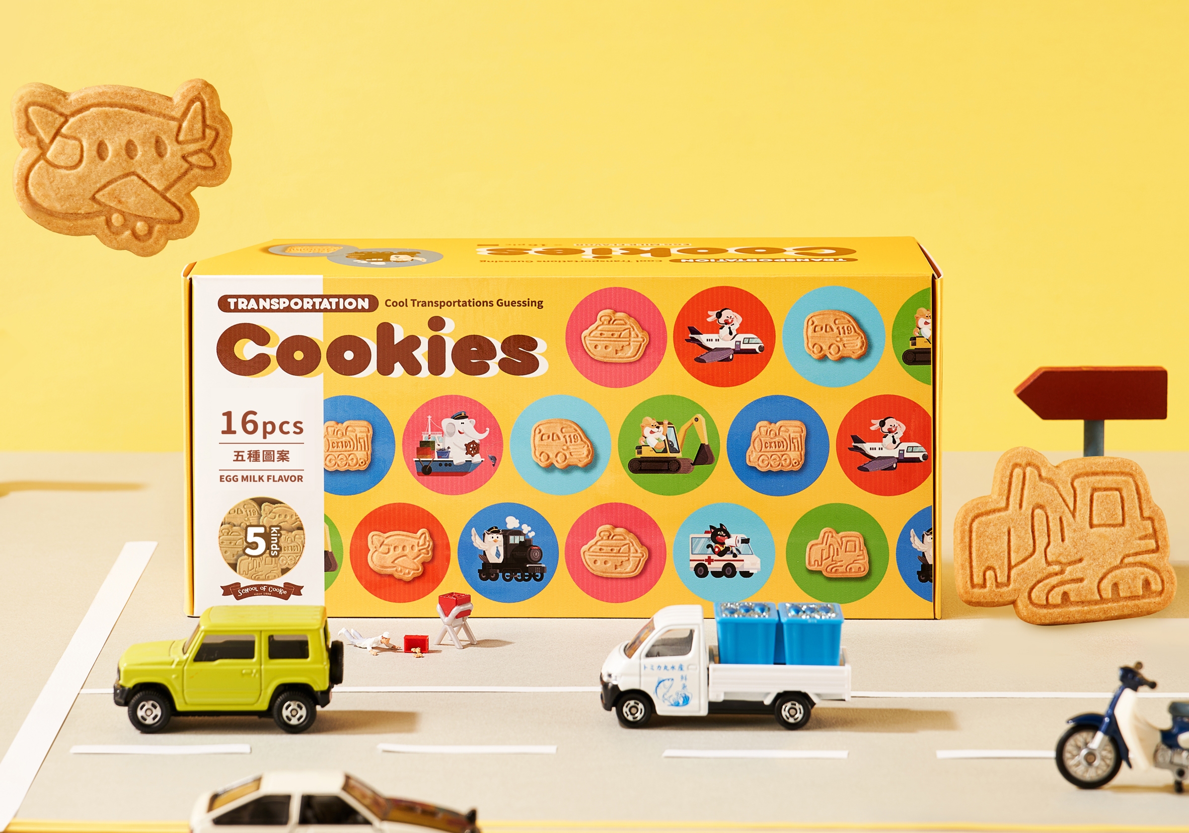 5款交通工具造型,扇形車庫的蒸汽火車CK101餅乾、塭仔港的漁船餅乾、醫療代表的救護車餅乾、土地建設代表的挖土機餅乾、觀光產業代表的飛機餅乾。同時具備寓教於樂、精美的設計和中英資訊,讓本產品更符合多種發展方向:親子消費、教育機構、禮品市場、國際出口。